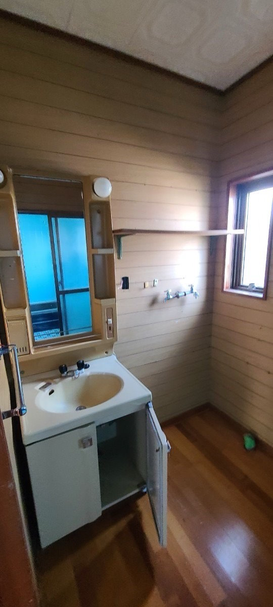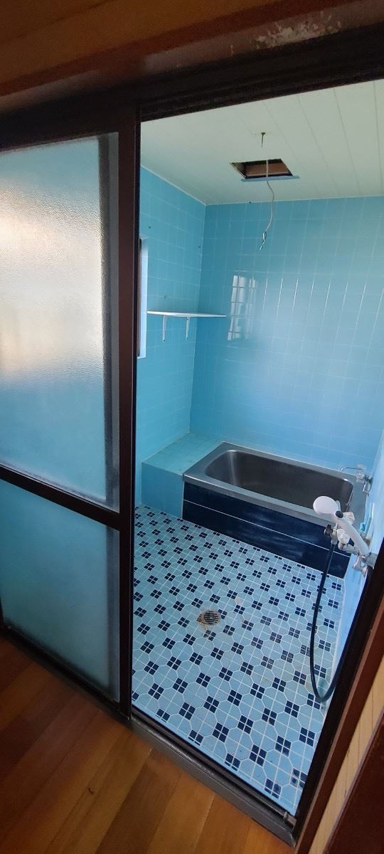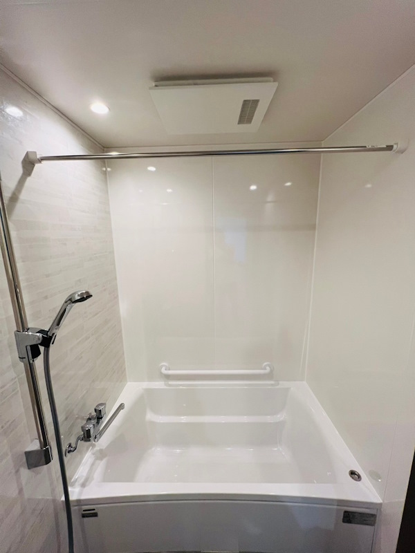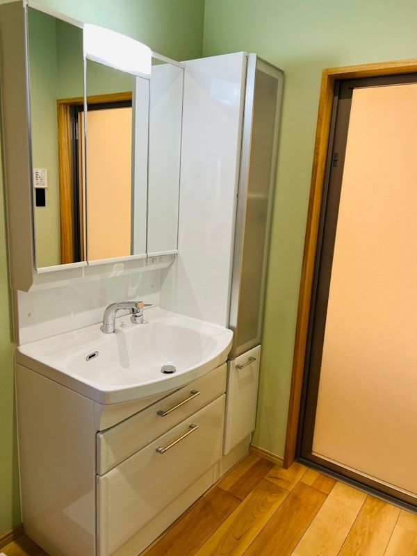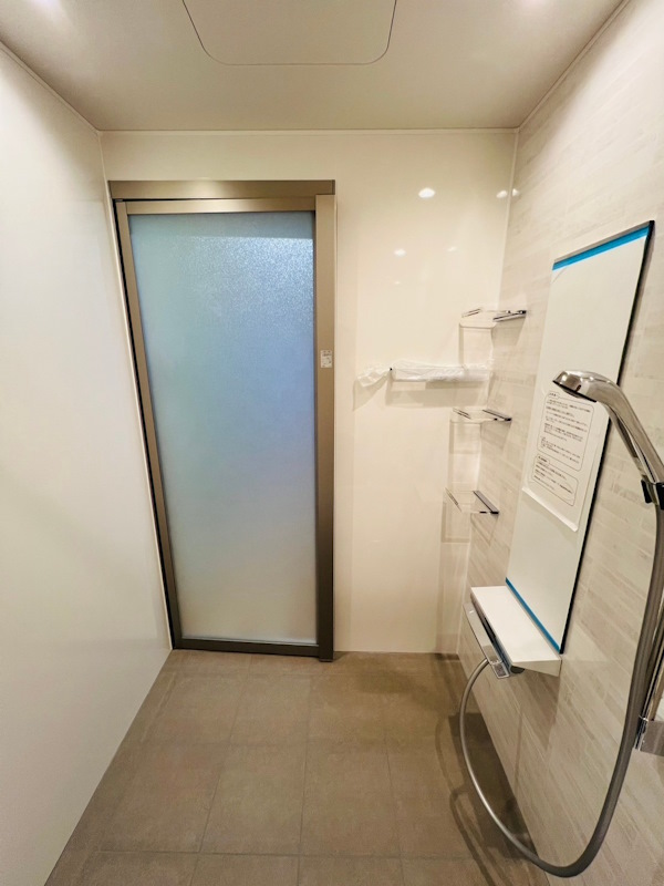 浴室だけでなく脱衣室へも壁固定式の暖房器具を取り付けているのがポイントです。