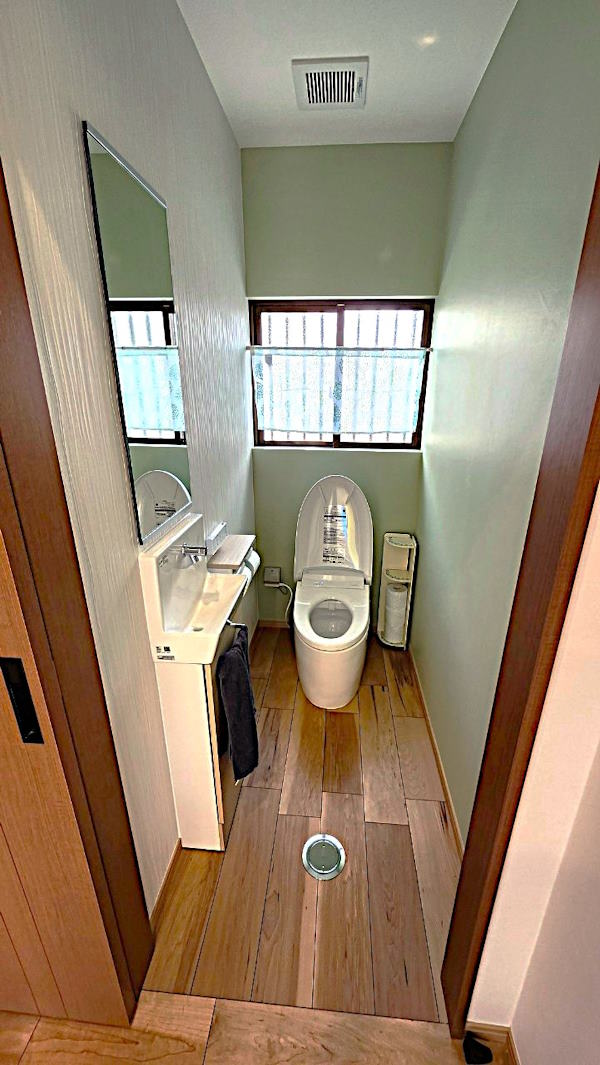 トイレの横幅があまり取れなかったため狭小手洗いを採用。開き戸ではなく引き戸のしたことで、開放的なトイレにリノベーションしました。