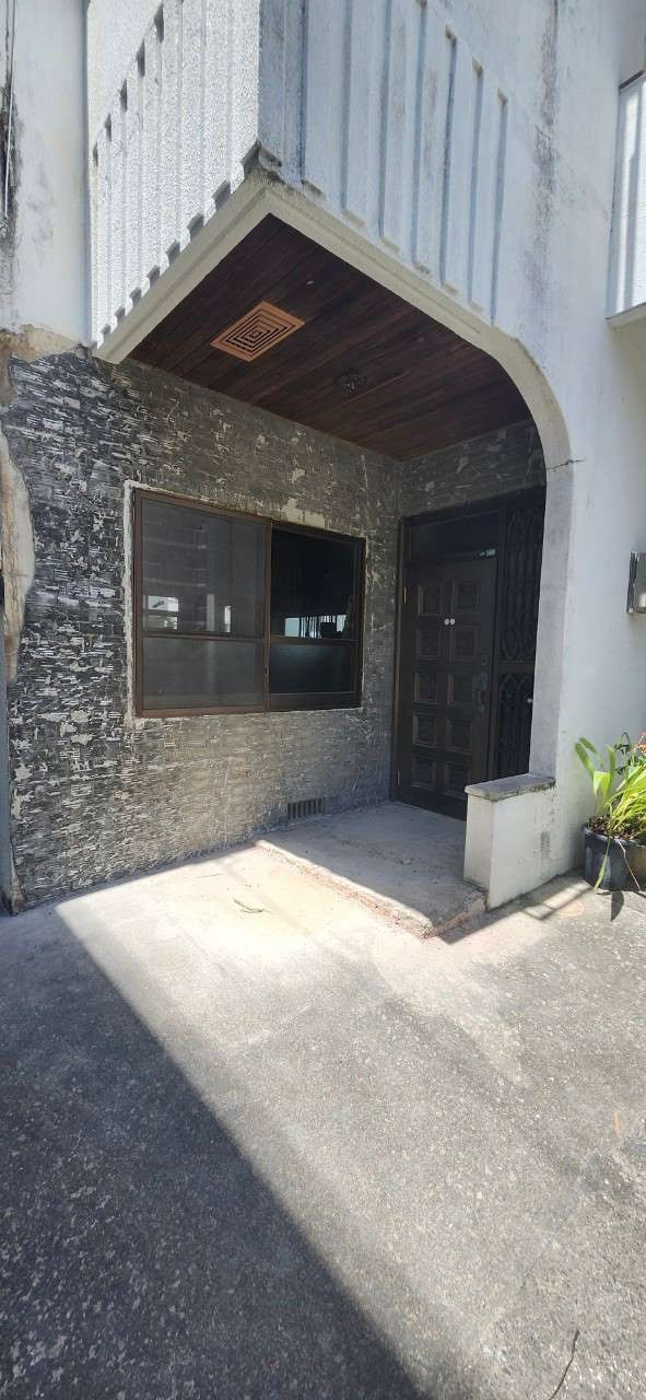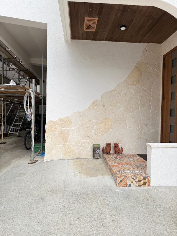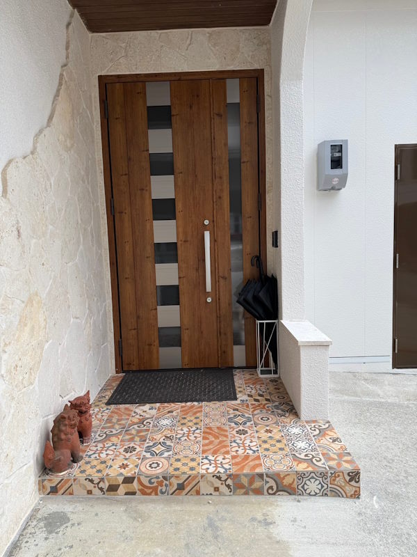 玄関は、トステムの木目調アルミドアと周囲の琉球石灰岩壁とピッタリな配色へ。